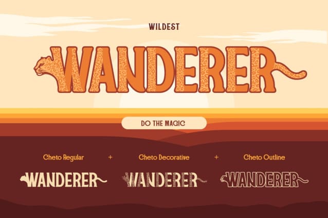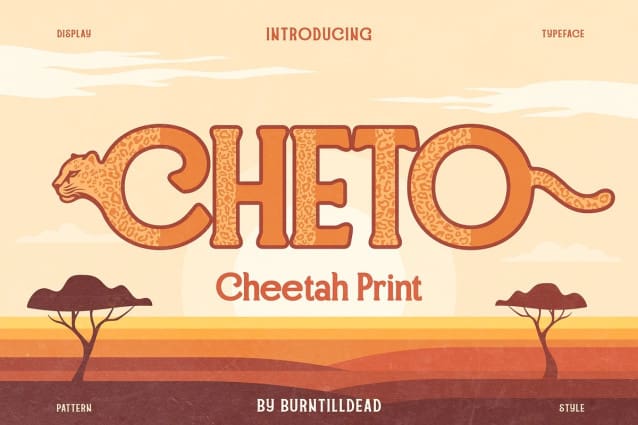 Cheto Display Font, a font with pattern and anatomies of cheetah in every letter. Cheto embodies the spirit of the wild through its distinctive and adventurous design perfect for creating impactful visual statement. Cheto has two unique alternate styles with heads and tails of cheetah. You also can combine regular, outline and pattern style. Where each letter reflected a cheetah. This font is very suitable for all design projects with a cheetah theme.