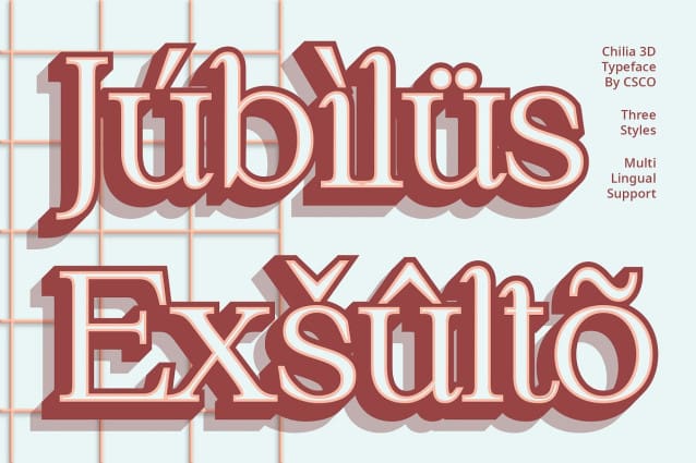Chilia 3D Font : A Stunning Blend of Serif and Dimension. Distinctive Serif Design Chilia 3D presents a serif typeface with moderate contrast, offering a balanced and harmonious appearance. Its timeless serif features lend a touch of elegance to any design.