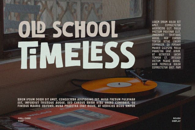 Chill Chirp Font is a rough display font with authentic and retro feels. It will be perfectly used for Branding, Logo Design, Lettering, Logotype, Clothing, Poster, magazine, packaging, posters, shopping bags, t-shirts, book covers, photography, special events and other design project.
