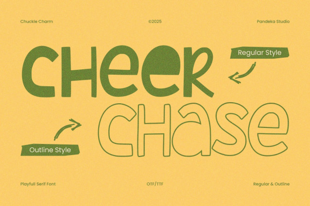Chuckle Charm is a playful handcrafted serif font available in 2 styles: Regular and Outline. With its fun curves and bold charm, it’s perfect for quirky serif duo, playful typography, whimsical design, fun lettering, creative style, bold aesthetic, and other standout design needs. Ideal for posters, packaging, greeting cards, social media, and DIY projects, Chuckle Charm adds a touch of joy and uniqueness to every creation.