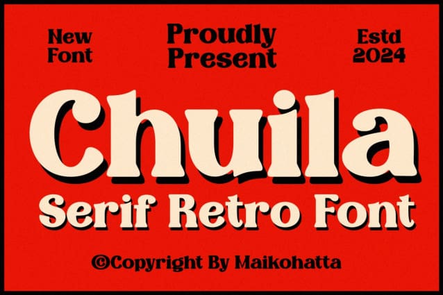 This font is made for personal use. Get the full version of the fonts if you want to use it for commercial purposes by purchasing the licenses here: https://creativemarket.com/MaikoHatta/282088064-Chuila-Serif-Retro-Font?u=fontlot123