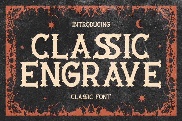 Classic Engrave – Classic Font, a vintage-inspired typeface with an elegant yet bold presence. This font features intricate, engraved-style serifs reminiscent of old Western signage and traditional book covers. Each letter has a handcrafted look, with ornamental curves and sharp edges that exude sophistication and a historical feel. The textured black background, along with distressed red decorative borders and celestial elements, enhances the font’s antique, mystical, and gothic aura. This font is perfect for projects that require a touch of timeless elegance and bold storytelling.
