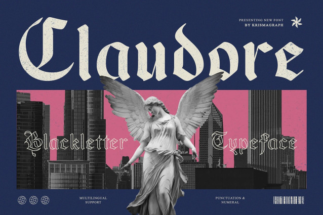 Claudore Font is a refined take on classic blackletter style, crafted for designers who want elegance with a rebellious edge. With textured details and balanced proportions, it strikes the perfect harmony between heritage-inspired calligraphy and modern design needs. Perfect for branding, packaging, music artwork, book covers, and fashion campaigns, Claudore comes with multilingual support and complete punctuation. A timeless typeface that elevates any design with bold personality and style.