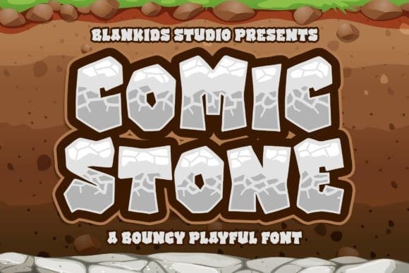 Comic Stone Font is a bouncy and playful display font inspired by playful stone-style typography. It is suitable for book covers, children’s books, comics, posters, packaging, merchandise, logotype, and much more.