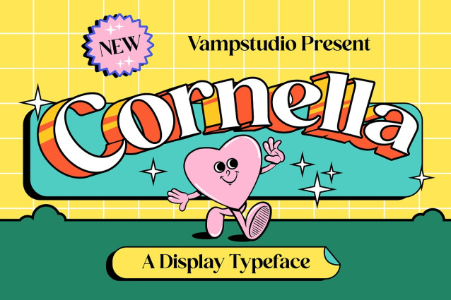 Cornella Font – Embrace the Playful Nostalgia of the 90s with this Retro-Inspired Display Font!Step into a world of fun and nostalgia with “Cornella,” a playful display font that captures the vibrant essence of the 90s. Get ready to infuse your designs with retro charm and a dash of whimsical flair.