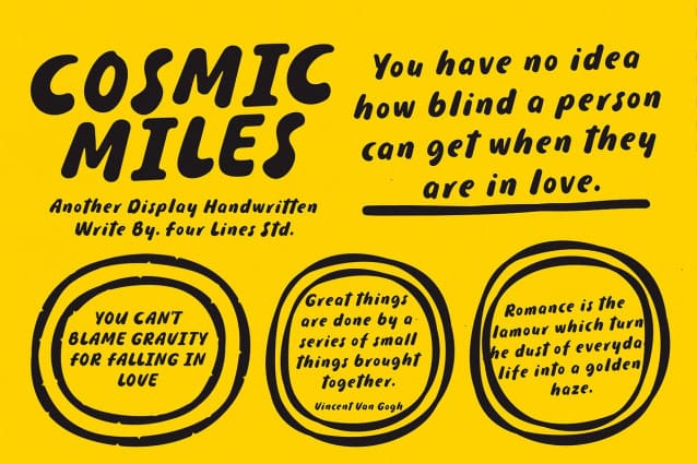 Cosmic Miles Font: A Captivating Handwritten Font for Inspiring Quotes. Elevate your designs to new celestial heights with Cosmic Miles, a stunning handwritten font designed specifically to breathe life into your favorite quotes. With its unique blend of thick and rounded strokes, this font encapsulates a sense of warmth and charm, adding a touch of cosmic magic to any project.
