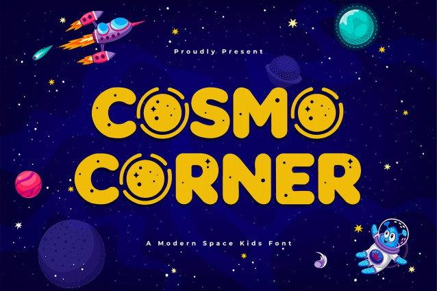 Cosmo Corner Font a modern space-themed font designed especially for kids. Featuring playful, rounded letters with a celestial touch, this font is perfect for children’s books, space-themed party invitations, educational materials, and creative branding.
