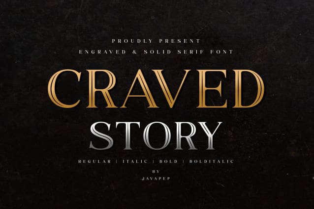 Craved Story Font is a splendid serif font family. Every character has an engraving detail so you can create the most stylish and elegant impression for your designs. CravedStory Font is also perfect for use in vintage-style projects. You will find both engraved and solid tyles you can mix and match for outstanding results!