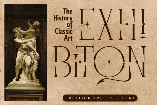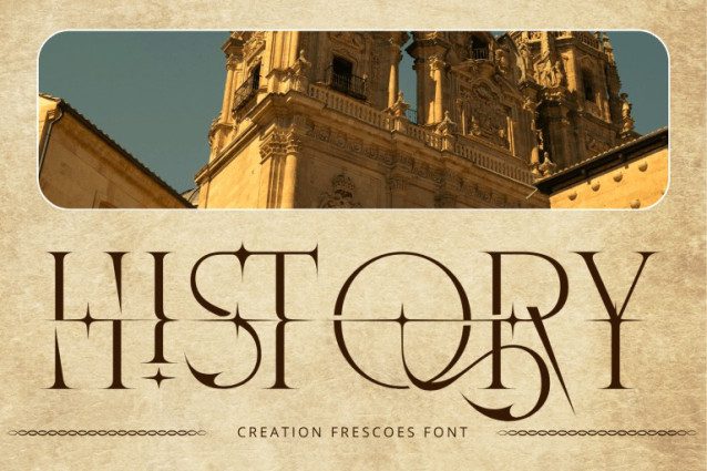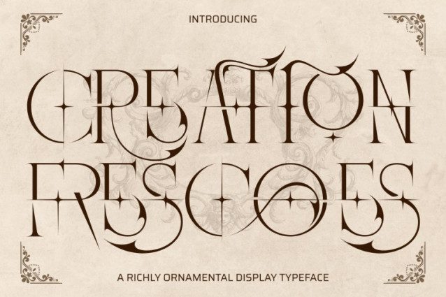 CREATION FRESCOES – LUXURY SERIF FONT, a luxurious Decorative Serif Display Font inspired by Renaissance artistry and Gothic aesthetics. Its elegant balance of sharp serifs and flowing curves creates a timeless visual experience — perfect for designers who want to express sophistication and artistic flair. This font combines ornamental beauty with strong structure, making it ideal for logos, editorial titles, posters, or any design seeking a vintage yet refined atmosphere.