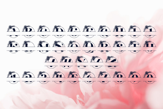 Crest Petal Split Monogram is a graceful serif font with split-letter styling and floral embellishments, perfect for crafting personalized crests, name signs, and upscale event designs. Each uppercase letter features a delicate botanical flourish and a clean center split, making it ideal for inserting names or custom text. This monogram font brings refined charm to weddings, boutique branding, and luxurious gifting.