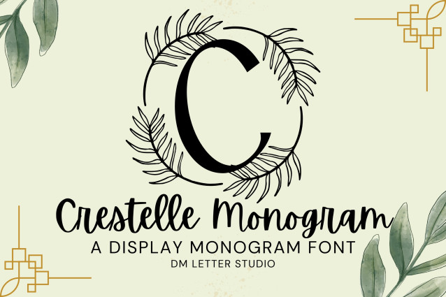This font is used only for demos (Demo license). If you want to use this font for commercial use please contact: https://dmletterstudio.com/product/crestelle-monogram-refined-serif-botanical-monogram-font/