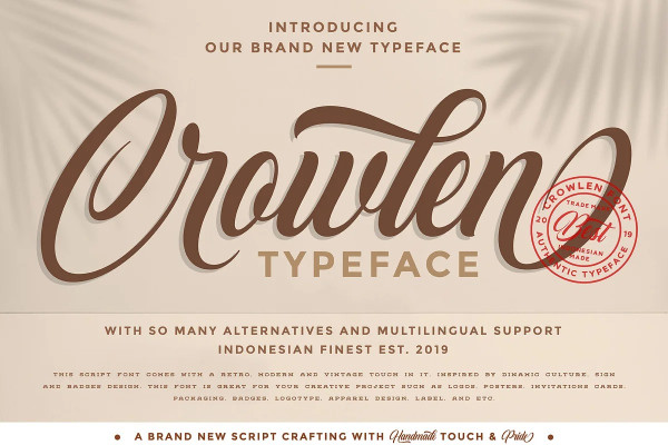Crowlen Script Font, this script font comes with a modern and vintage touch in it. Inspired by adventure and outdoor culture, sign and badges design. This font is great for your design project such as logos, posters. invitations cards, packaging, badges, logotype, apparel design, Label, and etc.