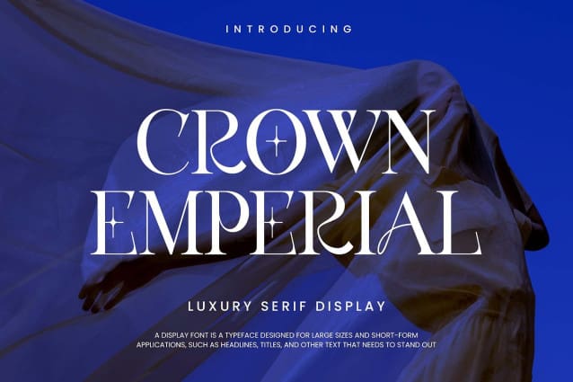 Crown Emperial Serif Display Font. The modern display font feels beautiful classy, elegant, and stylish. This font is ideally suited for a wide variety of projects, such as signature, stationery, logo, wedding, typography quotes, magazine or book covers, website headers, branding, and more. Also, fashion-related branding or editorial design displays both masculine and feminine qualities.