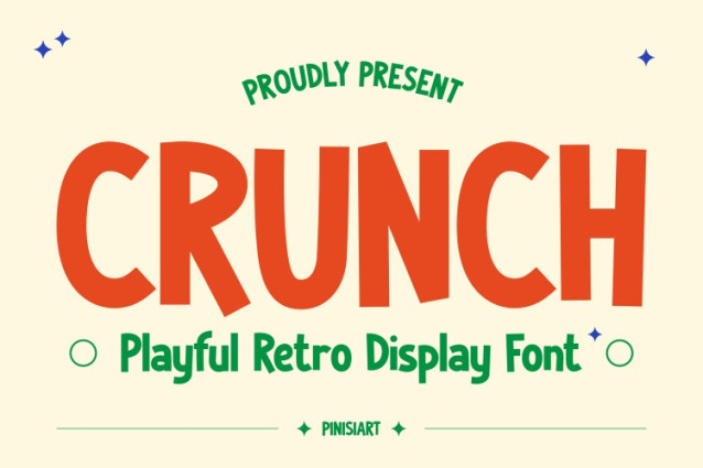 Crunch Playful Font is a bold, cheerful typeface designed to bring retro joy into your modern-day designs. With thick, rounded edges and a high-contrast look, it adds instant energy while staying warm and friendly. Inspired by classic snack packaging, old-school diner signage, and cartoon titles, it creates an engaging vibe that feels nostalgic yet fresh.