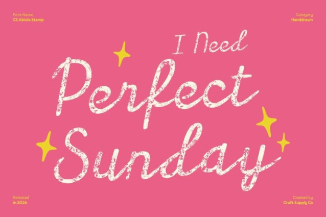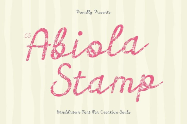 CS Abiola Stamp Font This is a modern script typeface inspired by graceful cursive handwriting and refined pen strokes. Its smooth curves and flowing connections create a natural rhythm that feels personal and expressive. Enhanced with a subtle stamp effect, the letterforms gain a handcrafted quality that adds warmth and character while preserving elegant readability.