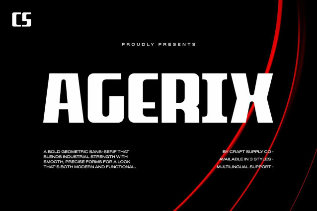 CS Agerix Font is a bold geometric sans serif font that blends industrial strength with smooth, precise forms, creating a visual identity that is both modern and functional. Each character is designed with clarity and structure in mind, offering designers a typeface that communicates confidence, innovation, and technical excellence.