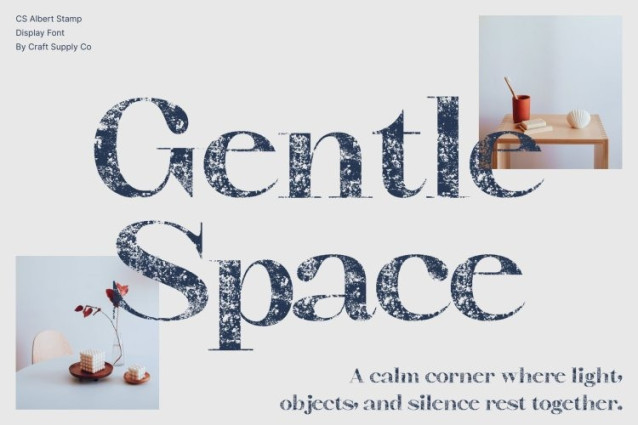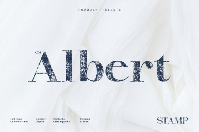CS Albert Stamp Font This is a classic serif typeface inspired by the elegance of Didone typography, defined by its strong contrast between thick and thin strokes. Its refined construction and vertical emphasis create a graceful, high-end appearance that feels formal, poised, and visually striking. The addition of a subtle stamp effect introduces depth while preserving its classic sophistication.