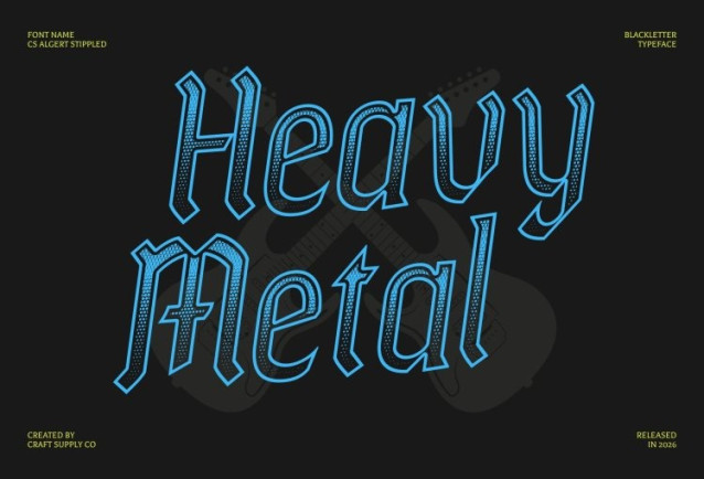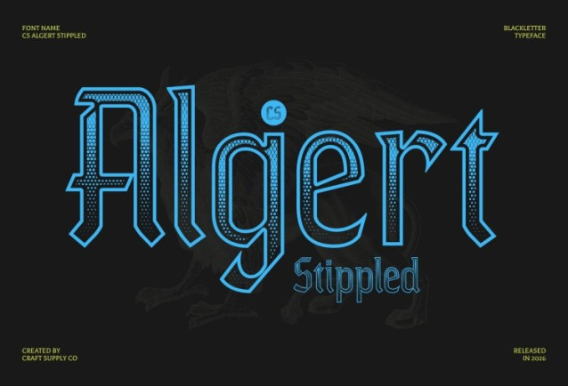 CS Algert Stippled Font This reimagines classic Blackletter typography through a modern lens, enriched with a dense stippled texture inspired by traditional ink-dot and stippling illustration techniques. The fusion of ornate historical forms with contemporary structure and dotwork detailing creates a font that feels dramatic, artistic, and unmistakably refined.