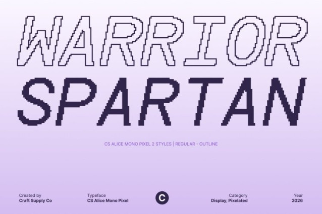 CS Alice Mono Pixel Font This is a modern monospaced sans serif font enhanced with pixel-style detailing that gives it a distinctive digital identity. Built with consistent spacing and clean geometric forms, this font delivers a structured, orderly appearance that feels both modern and reminiscent of classic screen typography.