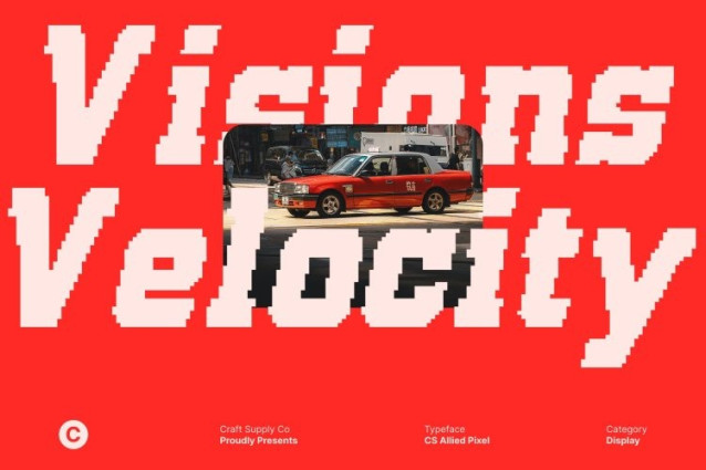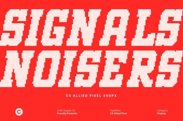 CS Allied Pixel Font This is a slab serif font built to deliver power, energy, and assertiveness through a distinctive pixel-based construction. Its strong serifs, bold structure, and blocky pixel forms create an athletic and competitive feel with a digital edge. Every letter stands firm with a modern, commanding attitude while channeling a retro arcade-inspired spirit that instantly grabs attention.