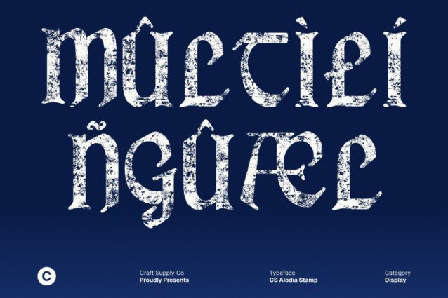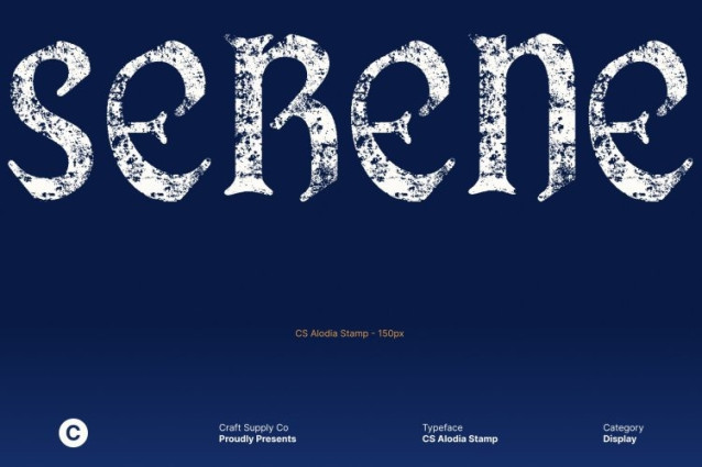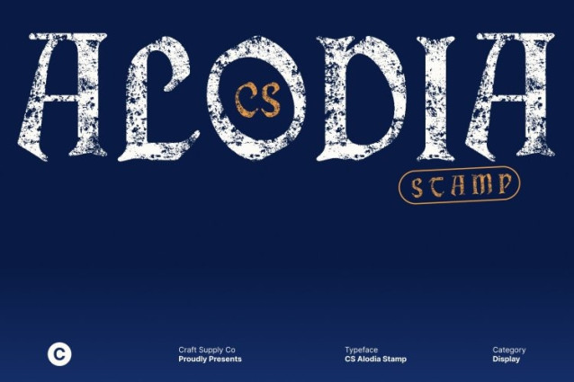 CS Alodia Stamp Font This is a Gothic display serif font inspired by the grandeur of medieval typography. Its bold, angular letterforms and intricate serif details convey a sense of history, power, and timeless sophistication. Enhanced with a stamp effect, the font gains an aged, handcrafted texture that reinforces its classic and historical character.