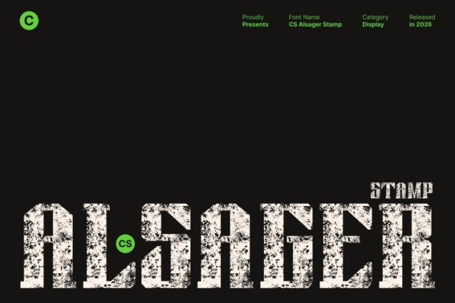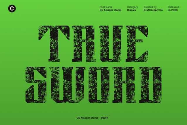 CS Alsager Stamp Font This is an industrial display font designed to express strength, control, and technical authority. Built with bold construction and sharp serif details, its mechanical structure feels solid and commanding. The stamped texture adds subtle wear and grit, introducing a vintage-industrial character that gives the font a raw, authentic presence.