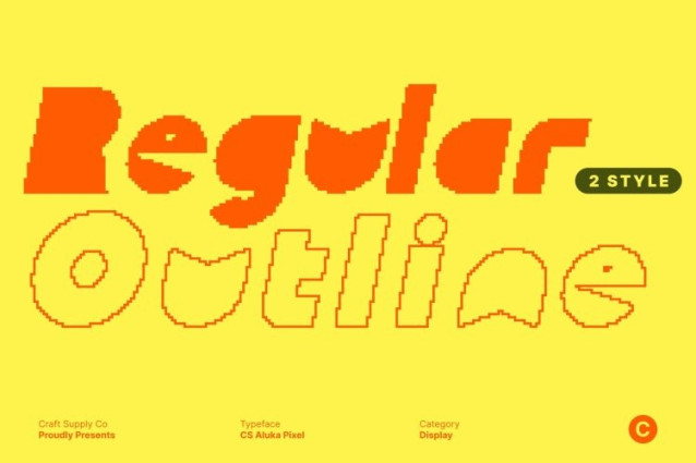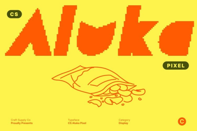 CS Aluka Pixel Font This is a bold display font inspired by the iconic visual language of classic arcade games, especially the playful spirit of Pac-Man. Its strong presence and eye-catching forms instantly bring a sense of fun, nostalgia, and digital excitement to any design.