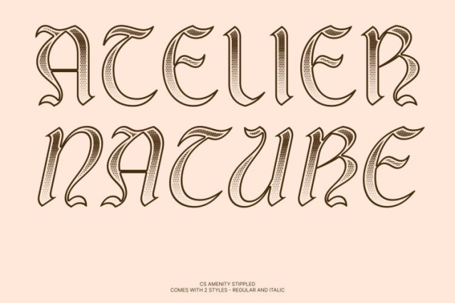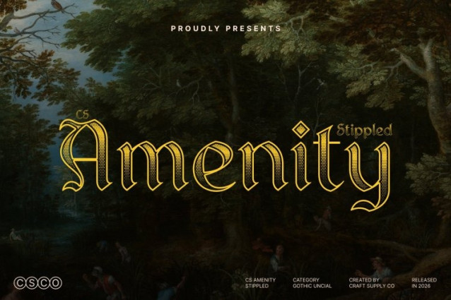 CS Amenity Stippled Font This is a display font that seamlessly blends the flowing curves of Uncial lettering with the bold, structured presence of Gothic typography. Inspired by medieval manuscripts and historical calligraphy, it features rounded letterforms, thick strokes, and ornamental flourishes now enriched with a dense stippled texture. This dotwork treatment, reminiscent of classic ink-dot and stippling illustration techniques, adds artistic depth and a handcrafted feel, enhancing its historical authenticity while maintaining a refined, modern finish.