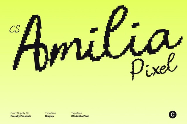 CS Amilia Pixel Font This is an artistic handwritten script font that blends fluid, expressive strokes with a subtle pixel character. Its flowing letterforms feel natural and warm, while the pixel styling introduces a unique digital texture that makes the font stand out. This combination creates a script that feels handcrafted yet modern, perfect for expressive and creative designs.