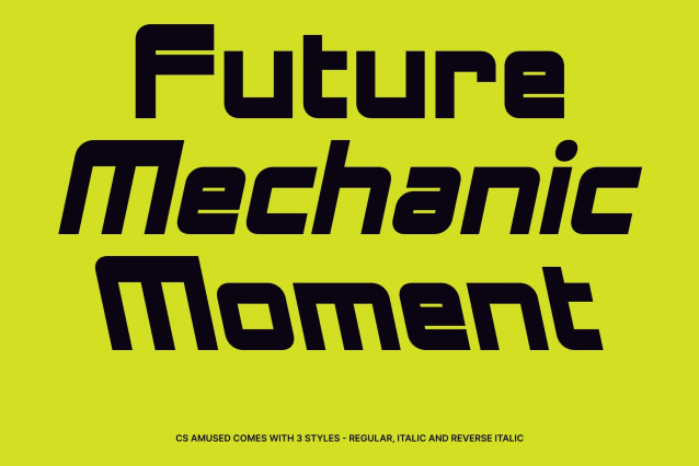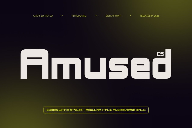 CS Amused Font – This is a bold techno-inspired sans serif font designed to radiate modern energy and confident visual power. Its clean, futuristic structure combines sharp lines with dynamic proportions, creating letterforms that feel fast, digital, and forward-thinking.