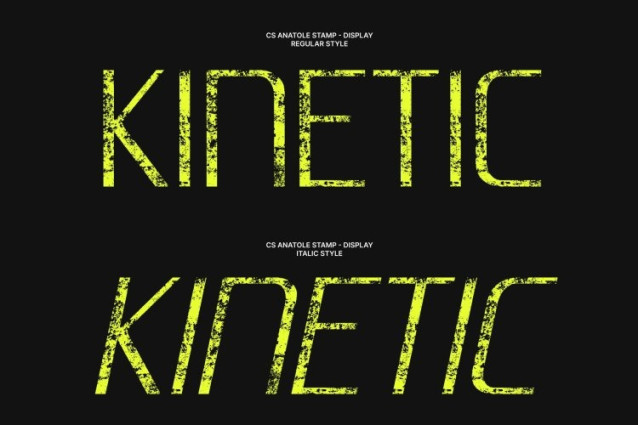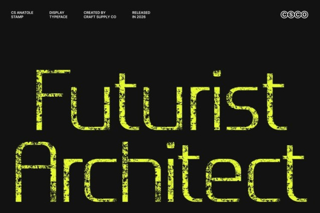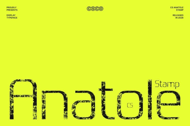 CS Anatole Stamp Font This is a modern futuristic display font designed to command attention through sleek geometry and contemporary energy, enhanced by a distinctive stamp texture. Its clean sans serif structure reflects precision and progress, while the stamped finish introduces subtle vintage depth, adding warmth and expressive character to its high-tech aesthetic.