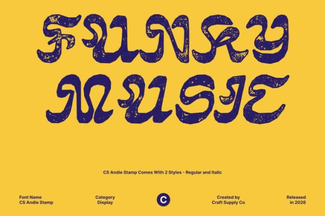 CS Andie Stamp Font This is a modern trippy display font infused with a bold stamp effect that adds raw texture and nostalgic depth. Its fluid, wavy letterforms still feel surreal and psychedelic, but the stamped finish introduces worn edges, ink irregularities, and handcrafted imperfections. This combination creates a striking contrast between expressive modern forms and an old-school, analog print aesthetic.