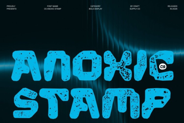 CS Anoxic Stamp Font This is a bold experimental display font created for designers who refuse to follow conventions. Its unconventional letterforms and abstract structure remain daring and expressive, now enhanced by a rugged stamp effect. The textured, imperfect impressions introduce a raw, tactile quality making each character feel forcefully pressed, worn, and visually charged with attitude.