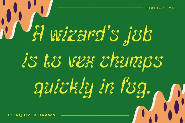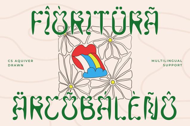 CS Aquiver Drawn Font – This is a display font that channels the essence of psychedelic design with bold, free-flowing curves and wild, unconventional letterforms. Its dynamic rhythm and fluid shapes create an immediate sense of movement and visual excitement—making it perfect for projects that want to feel spontaneous, funky, and alive.