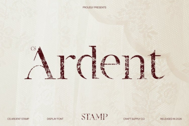 CS Ardent Stamp Font This is an elegant serif display font that blends timeless serif craftsmanship with a modern stencil construction. Its bold serifs and clean cutout details create a structured, confident appearance that feels both refined and contemporary, making it suitable for sophisticated visual identities.