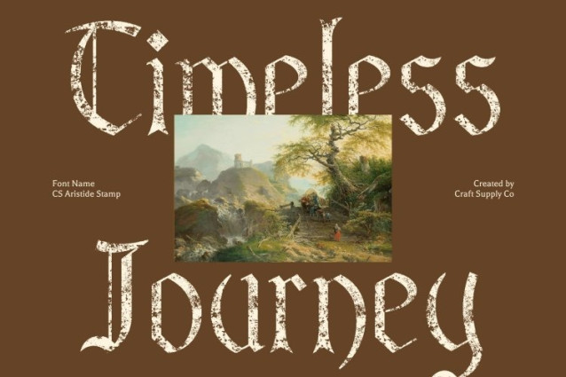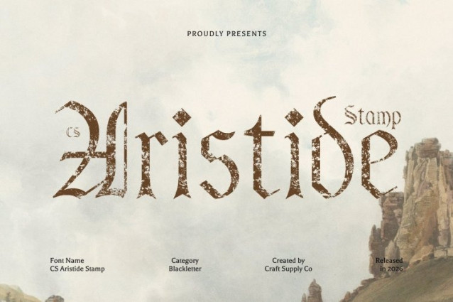 CS Aristide Stamp Font This is a bold blackletter display font that fuses the dramatic intensity of Gothic calligraphy with a clean, modern sensibility. Sharp angles and commanding strokes are refined through balanced proportions and thoughtful spacing, resulting in a typeface that feels expressive, artistic, and confidently modern.