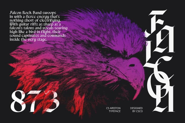Ideal for Themed Projects Whether you’re working on luxury branding, formal invitations, or themed projects, CS Ariston provides the perfect blend of tradition and boldness. Its unique Blackletter style enhances the visual appeal of any design, adding a touch of classic sophistication and strong presence.