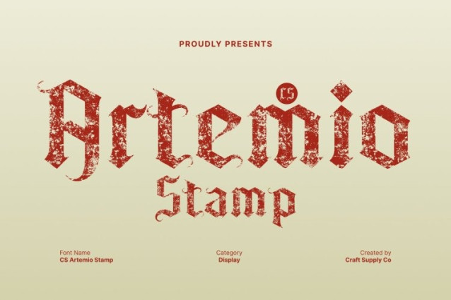 CS Artemio Stamp Font This is a bold display font inspired by classic Blackletter traditions, reimagined with modern decorative flair. Its sharp angles, dramatic strokes, and ornate shapes create a commanding visual presence that immediately draws attention. Designed for expressive and impactful displays, this font brings historical richness into contemporary creative work.