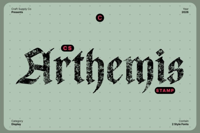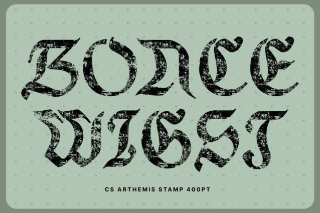CS Arthemis Stamp Font This is a medieval Blackletter display serif font that blends intricate gothic letterforms with a powerful historical presence. Inspired by classic manuscript typography, its sharp strokes, dramatic angles, and ornate details create a bold visual identity rooted in tradition, authority, and timeless grandeur.