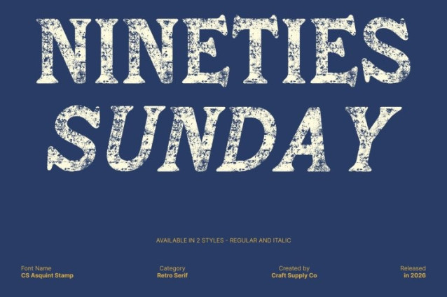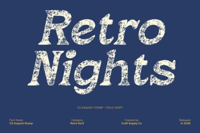 CS Asquint Stamp Font This is a bold serif font that blends classic serif elegance with a retro-cute aesthetic. Its thick strokes and sturdy structure create strong visibility and confident weight, allowing each letterform to stand out clearly. The traditional serif foundation delivers timeless sophistication, while the stamped texture introduces a subtle worn effect that enhances its vintage charm.