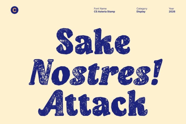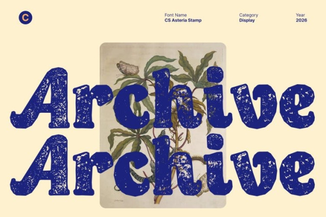 CS Asteria Stamp Font This is a bold display serif font inspired by the unmistakable character of classic 90s typography. Its strong, confident letterforms and rich serif details deliver a sense of tradition and retro sophistication. This font captures the bold spirit of the era while maintaining a timeless structure that remains visually impactful today.
