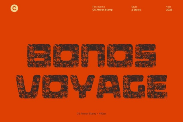 CS Atreon Stamp Font This is a bold display sans serif font designed to command attention. Built on strong geometric foundations, this font delivers powerful visual impact while introducing a distinctive stamp effect that adds texture, depth, and character. The result is a striking balance between futuristic strength and vintage expression.