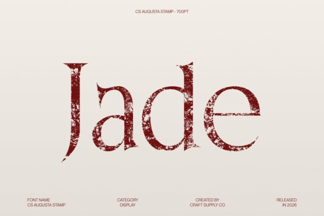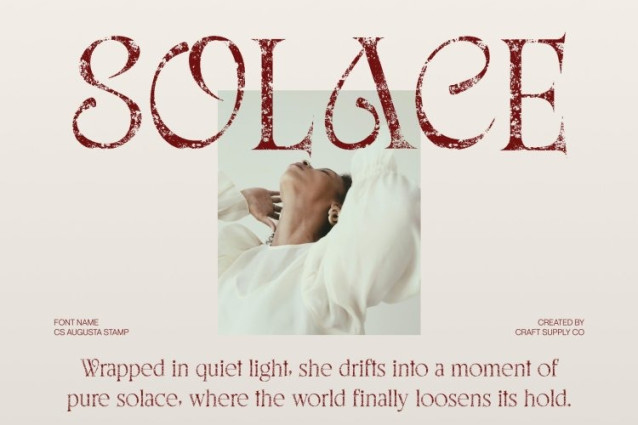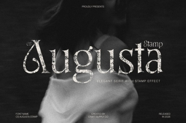 CS Augusta Stamp Font This is an elegant serif font defined by smooth, flowing curves and beautifully refined proportions. Its graceful letterforms create a luxurious and feminine impression, while the subtle stamp texture adds organic depth and artistic character. This balance between softness and texture gives the font a distinctive presence polished yet expressive.