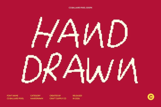 CS Ballard Pixel Font This is a gritty yet stylish messy handwritten font that celebrates imperfection, spontaneity, and creative freedom. Its freely scribbled letterforms are enhanced with subtle pixel details, giving the font a unique blend of raw hand-drawn expression and retro digital character. The result is playful, energetic, and full of visual personality.