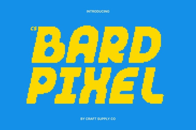 CS Bard Pixel Font This is a bold, chunky display font designed with thick strokes and strong geometric forms, enhanced by distinctive pixel details. Its solid construction delivers a confident, modern presence, while the pixel style introduces an unmistakable 8-bit, old-digital character. The result is a font that feels powerful and eye-catching, perfectly echoing the visual language of classic arcade screens and retro digital graphics.