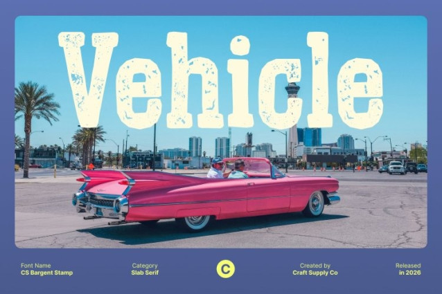 CS Bargent Stamp Font This is a modern slab serif font that balances soft curves with strong, assertive forms. Inspired by sporty and campus-style typography, it conveys energy, confidence, and stability. The added stamp effect introduces a subtle distressed texture, giving the font a tactile, vintage feel that recalls classic athletic prints and traditional letterpress techniques.