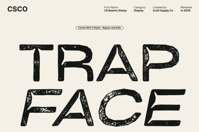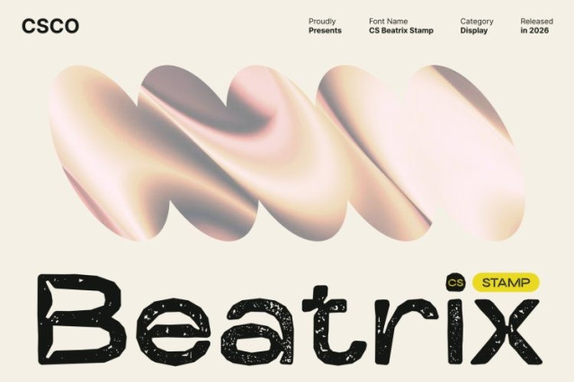 CS Beatrix Stamp Font This is a modern sans-serif inktrap font defined by clean, sharp lines and precise technical detailing. Its distinctive inktrap cuts small notches placed at critical corners are designed to reduce ink buildup and soften sharp angles, resulting in improved clarity and visual balance. The added stamp texture introduces subtle imperfections, blending technical accuracy with a tactile, handcrafted feel.