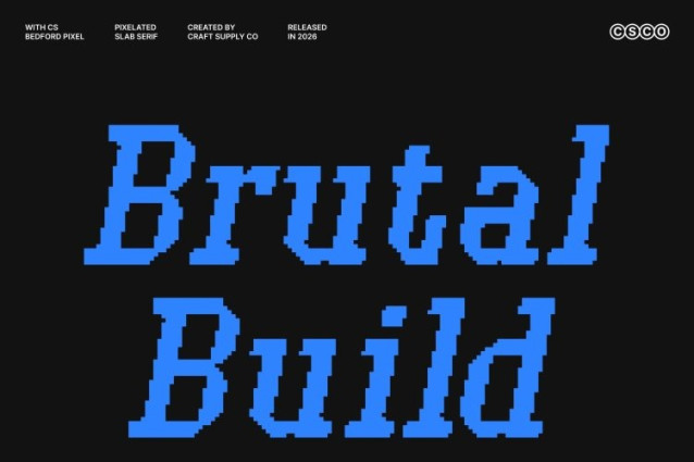 The industrial influence of this font is emphasized through its solid construction and architectural feel, now reimagined with an old-digital, pixel-inspired aesthetic. The slab serifs add weight and stability, while the pixel grid brings a subtle retro-futuristic vibe reminiscent of early digital screens.