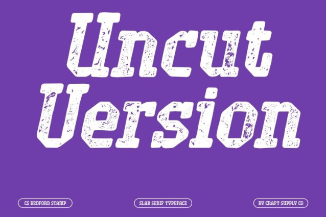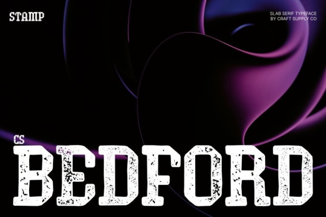 CS Bedford Stamp Font This is a modern slab serif font that merges futuristic aesthetics with bold, industrial-inspired construction. Its strong geometric letterforms project confidence and authority, while the stamp effect introduces a textured, slightly worn surface that adds depth and realism. This combination creates a typeface that feels modern and forward-looking, yet grounded with tangible, tactile character.