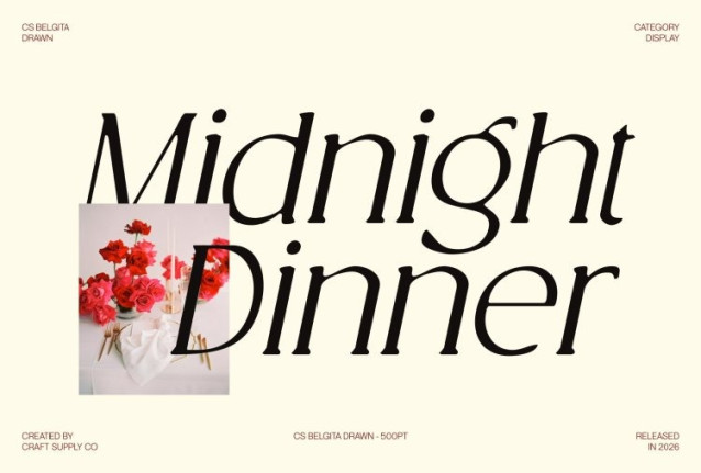CS Belgita Drawn Font This is an elegant serif font crafted with clean, slender letterforms and enhanced by a subtle drawn finish. Its refined construction communicates confidence and sophistication, while the handcrafted texture softens the precision, adding warmth and personality.
